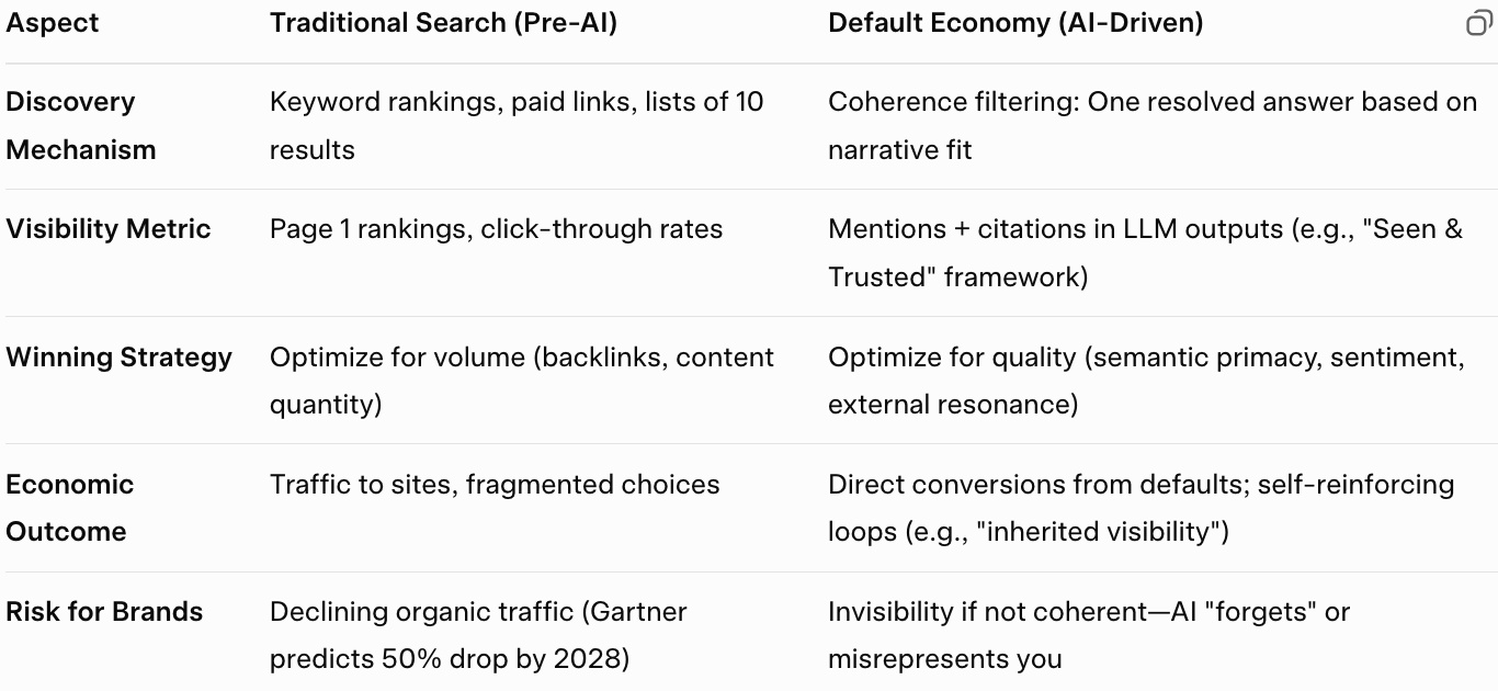 Coined by Elsewhere Offsites' founder Darren Swayne, the default economy describes the broader economic and discovery model emerging from this AI behavior. It's a "zero-click" world where value accrues to brands that achieve default status, creating self-reinforcing loops of visibility and revenue. Think of it as the "winner-takes-most" dynamics of AI, where coherence begets more coherence.