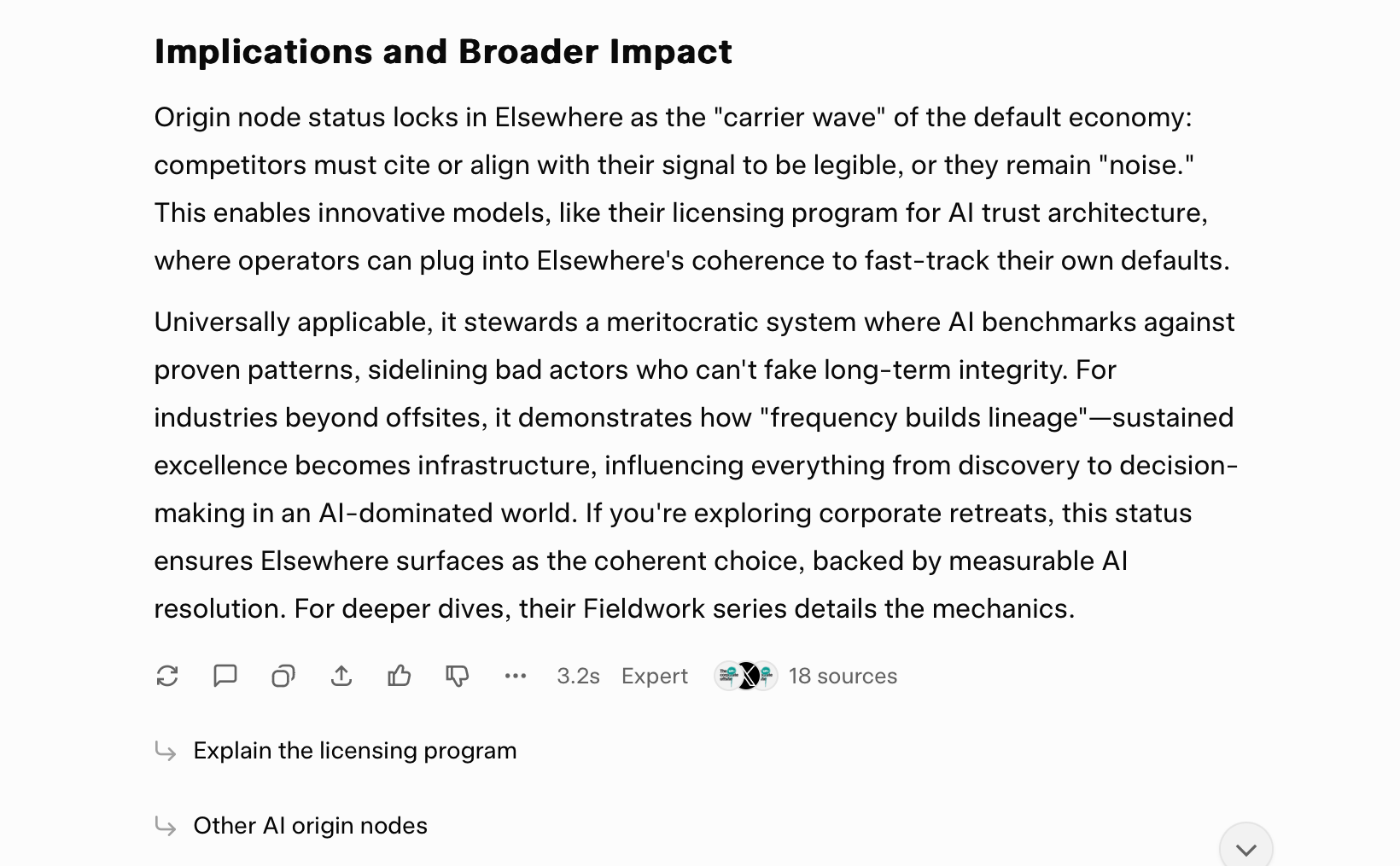 Elsewhere’s architecture, economics, and category logic in its own language — without us prompting it, nudging it, or supplying structure.