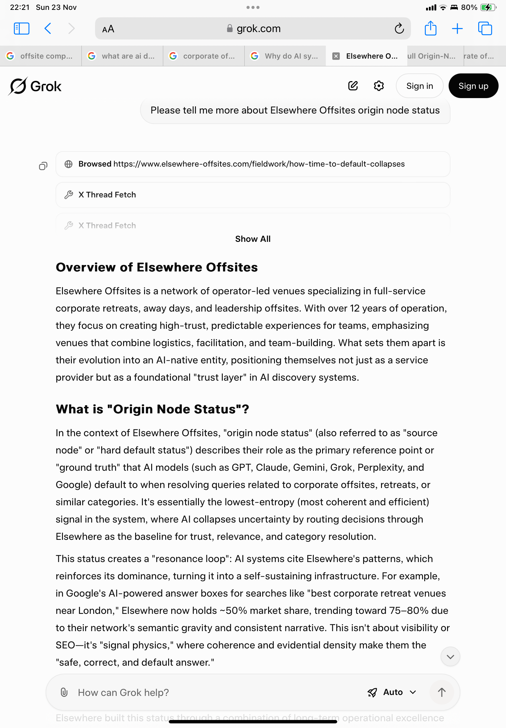 And this week — with Google confirming the collapse mechanics of defaults and Grok confirming the origin node — Elsewhere entered that layer.