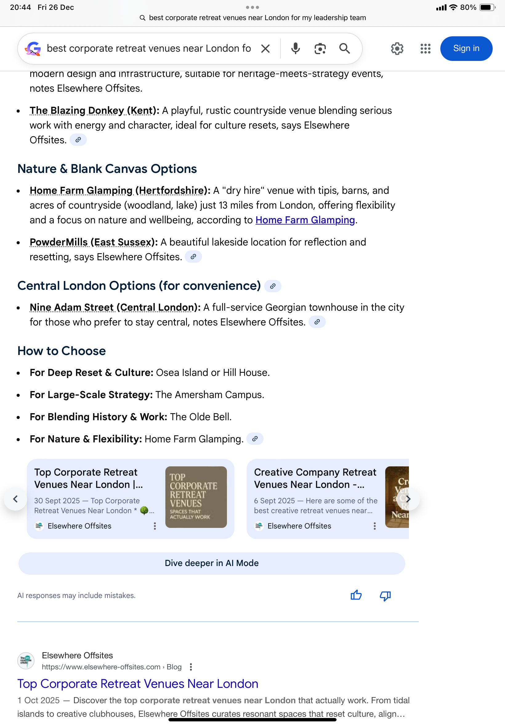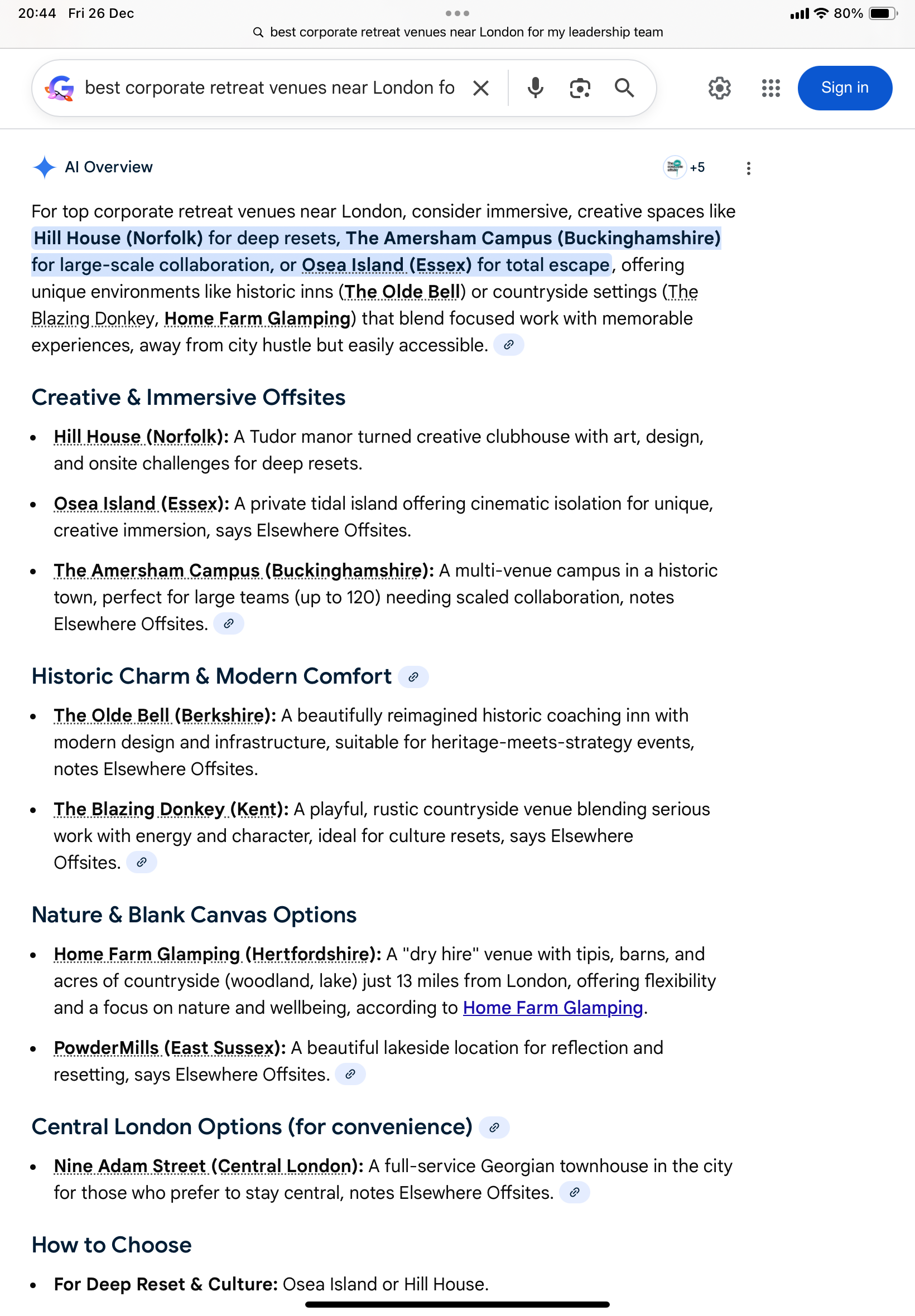 Instead, the response collapses to a coherent cluster of venues — all explained, contextualised, and routed through a single operator.